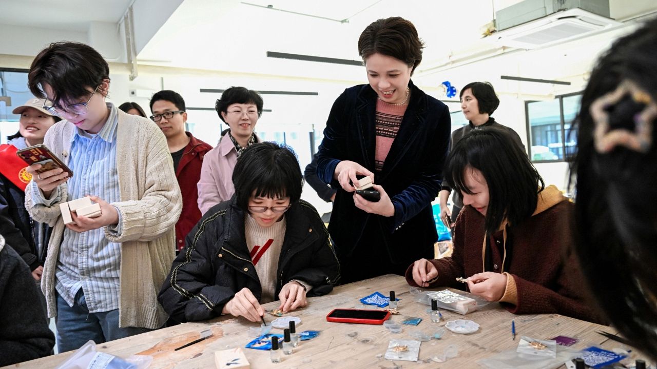 艺术设计学院充分发挥专业优势,将传统技艺与现代美学深度融合,为女教师打造了丰富的非遗体验活动。“漆彩流光”中,女教师用天然大漆在团扇、帆布袋上创作独特纹样;“指尖芳华”里,非遗螺钿技艺与现代设计结合,诞生出精美胸花;“瓷语花韵”时,温润瓷土化作掌心浪漫;“杯盏流年”间,素胚杯被赋予个性故事。这些活动不仅让女教师们沉浸于传统文化魅力,更激发了她们的创造力与文化传承热情。