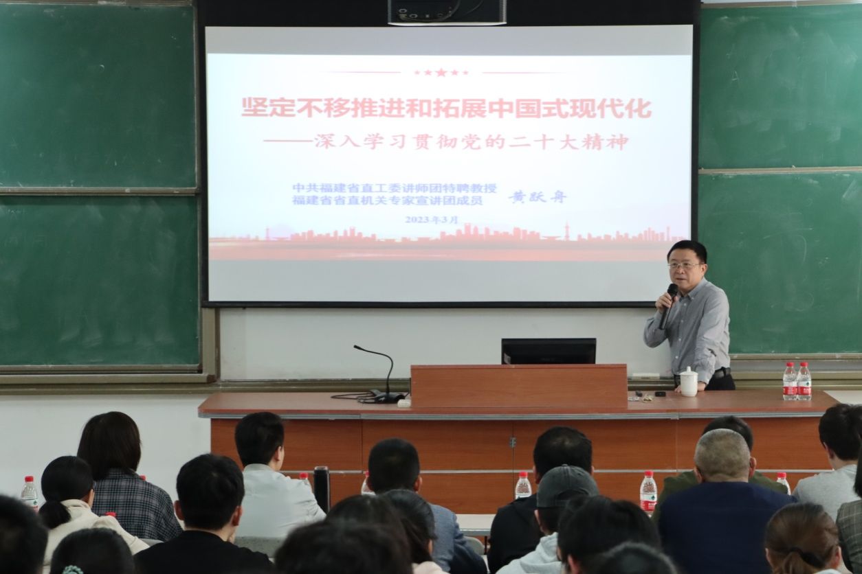 3月21日下午,中共福建省直工委讲师团特聘教授、省直机关专家宣讲团成员黄跃舟应邀到必赢官网开展“坚定不移推进和拓展中国式现代化——深入学习贯彻党的二十大精神”专题讲座。马克思主义学院部分教师、连江校区“青马”班部分学员、校习近平新时代中国特色社会主义思想读书社部分社员参加学习。