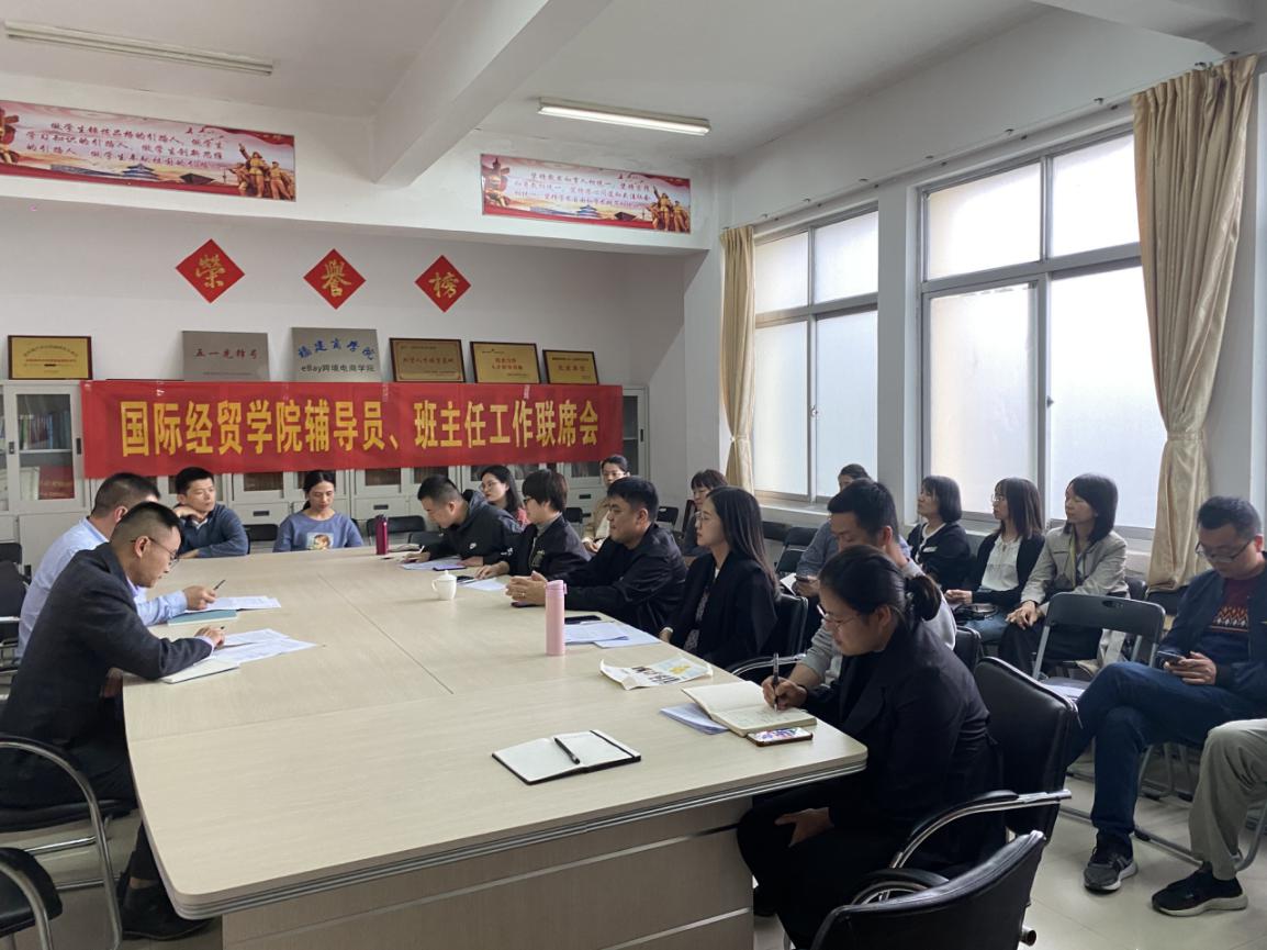 为进一步加强学生思想政治工作,强化学风建设,充分发挥全员育人合力,近日,国际经贸学院召开辅导员、班主任工作联席会议,学院党委副书记廖新平(主持党委工作)、党委副书记许模春及全体辅导员和班主任参加了此次会议。