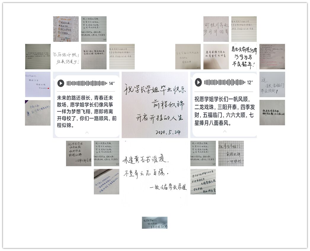 受新冠疫情影响,2020届毕业生无法拥有一个传统的毕业典礼。在这个特殊的毕业季,财务与会计学院读书社成员们通过手写祝福、语音祝福等方式为学长学姐们送上诚挚的祝福。