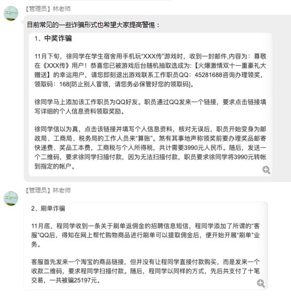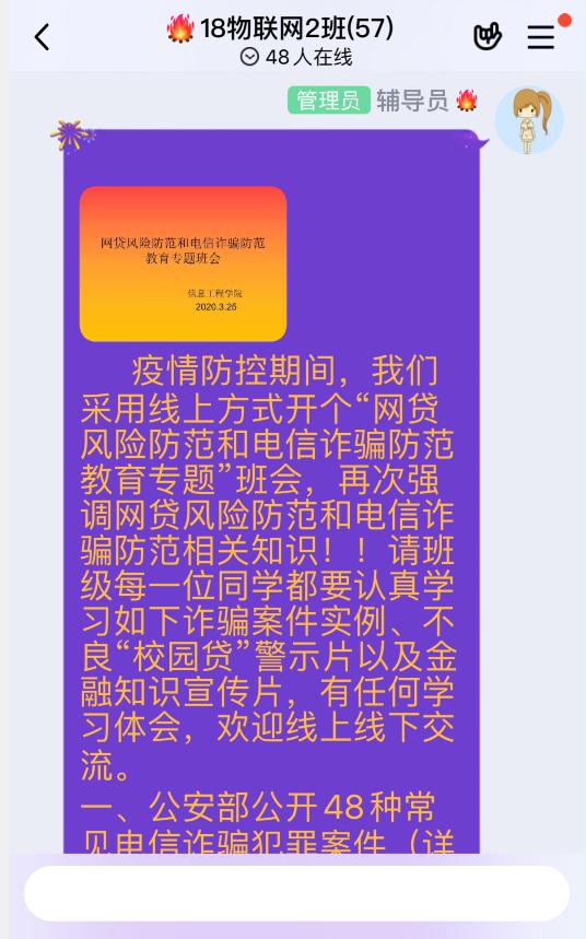 疫情防控期间,专题班会采用线上方式开展,信息工程学院辅导员们通过QQ班级群、QQ视频会议、腾讯会议等多种新媒体方式将常见电信诈骗案件、不良“校园贷”警示等学习材料传达给每个班级的每一位学生,并结合日常工作案例和线上交流等方式提升班会效果。