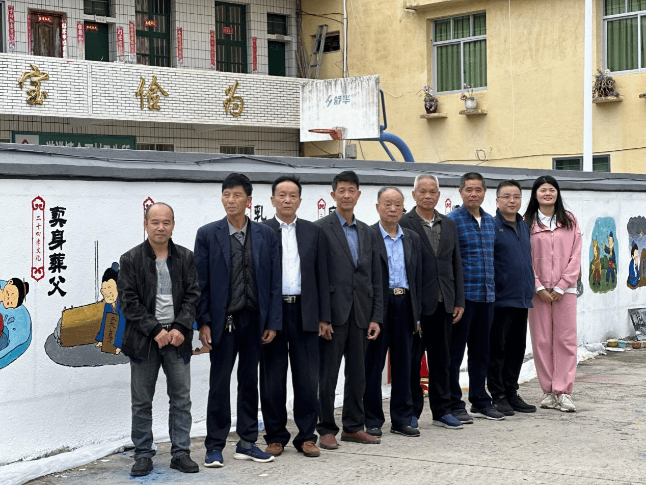 金石村乡贤和带队老师在墙绘前合影留念