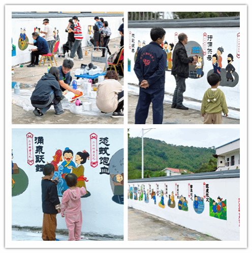 通过前期的实地考察,师生们确定以“二十四孝”作为本次墙绘的主题,并由16名入党积极分子通力协作完成设计图。在绘制过程中,成员们克服了时而炎炎烈日、时而细雨绵绵等困难,每一次起笔抬笔都力求准确,做到“零失误”。实践团队成员许晴说道:“很荣幸能参与这次墙绘实践活动,能用手中的画笔,描绘孝道之美,我感到非常的骄傲和自豪。”不时有村民驻足观望点赞,感叹道:“怪好看的!大学生真是多才多艺,把我们的村庄建设如此之美!”