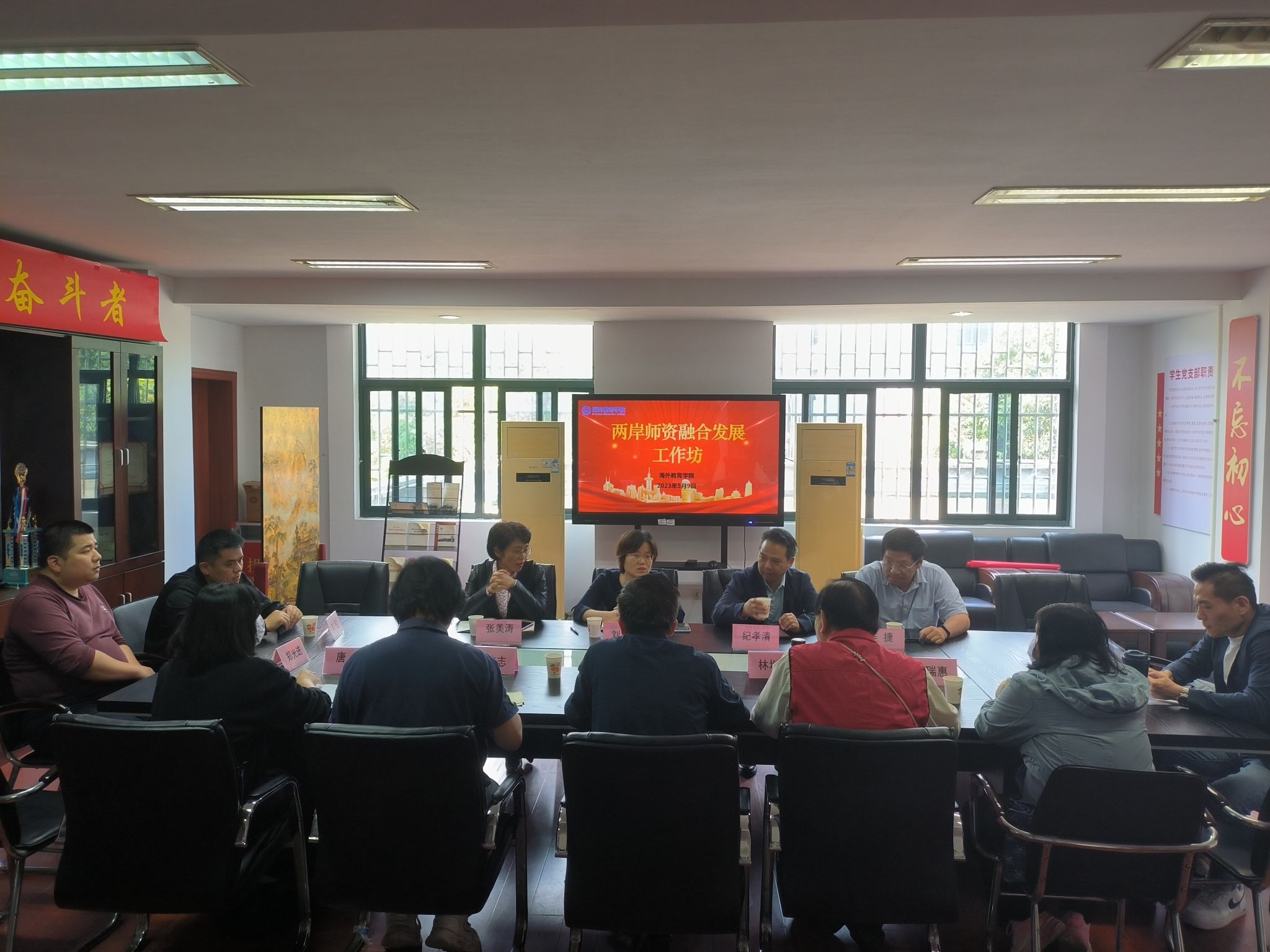 近日,海外教育学院联合工商管理学院、国际经贸学院携手驻校台籍师资举办题为“以教为媒通两岸、携手融合促发展”的两岸师资融合发展工作坊交流活动。海外教育学院、国际经贸学院、工商管理学院相关负责人,闽台专班行政主任黄晓,学院相关老师和台籍教师参加了交流。