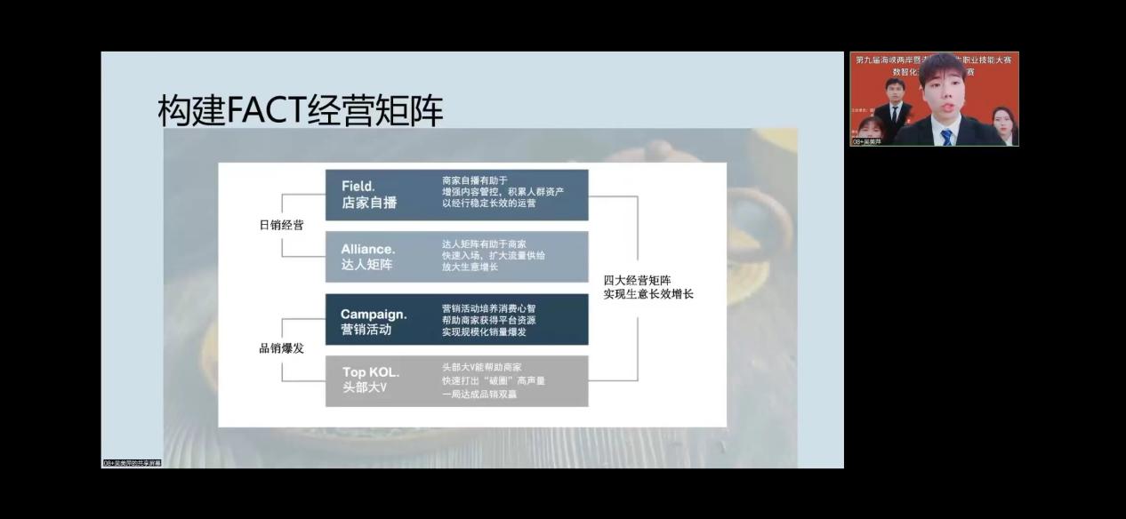 近日,在2022年度第九届海峡两岸暨港澳大学生职业技能大赛的数智化运营与管理竞赛中,必赢官网电子商务专业学生朱晓华在本科个人组赛项中荣获一等奖(指导老师:卢美琴),由电子商务和市场营销专业学生组成的参赛团队(蔡帅哲、吴美萍、周佳睿、陈茜航、周榕榕、李钰、符红宇,指导老师:卢美琴、詹惠娜)在本科团体赛项中荣获三等奖。