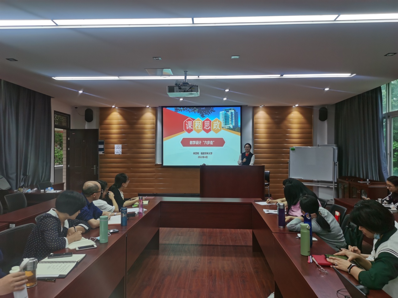 课程思政教学研究中心成员张潇老师、林春虹老师和李冰老师在会上分享了专业课程思政教学案例,林贤明副教授点评后作《课程思政教学设计“六步走”》专题报告。她认为课程思政教学设计要钻研知识点,聚焦课程目标,挖掘凝练思政元素,精选思政教学素材,设计教学实施过程,有机融合思政教学素材与专业知识,检验学习成效,进行有效教学反思和持续改进。同时,课程思政教学设计要紧跟课程知识,体现契合度,要遵循学生思想成长需求规律,体现高阶性。