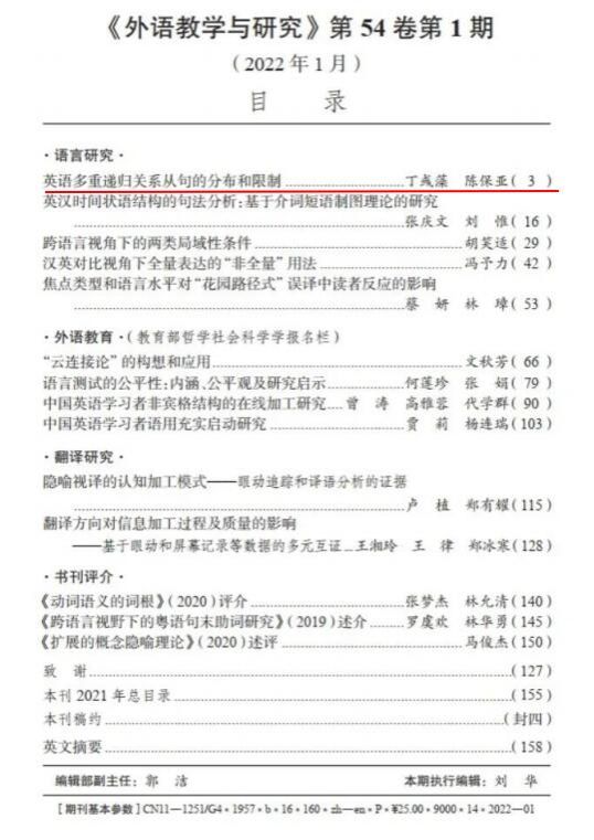近日,国内语言学综合排名第一的权威期刊《外语教学与研究》以新年首篇的形式发表了必赢官网海外教育学院丁彧藻博士及其合作者的论文《英语多重递归关系从句的分布和限制》,这是必赢官网首次以第一署名单位在该权威期刊上发表研究性论文。