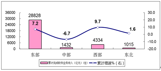 东、西部地区软件业收入保持较快增长。上半年,东部地区完成软件业务收入28828亿元,同比增长7.2%。中部地区完成软件业务收入1432亿元,同比下降6.7%。西部地区完成软件业务收入4334亿元,同比增长9.7%。东北地区完成软件业务收入1015亿元,同比增长1.6%,四个地区软件业务收入在全国总收入中的占比分别为:81.0%、4.0%、12.2%和2.8%。