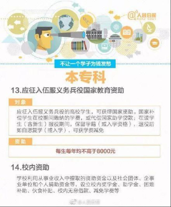应征入伍服义务兵役国家资助:应征入伍服义务兵役的高校学生,可获得国家资助。国家补偿学生在校期间缴纳的学费,或代偿国家助学贷款;在读学生(含新生)服役期间,保留学籍(或入学资格),退役后如自愿复学(或入学),可获学费减免,每人每年不超过8000元。
