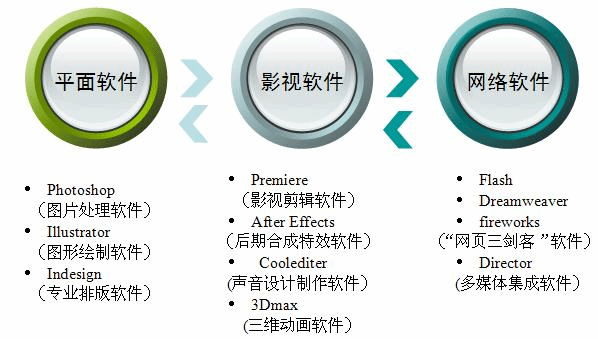 2. 专业软件课:平面设计软件应用;影视设计软件应用;网络设计软件应用。