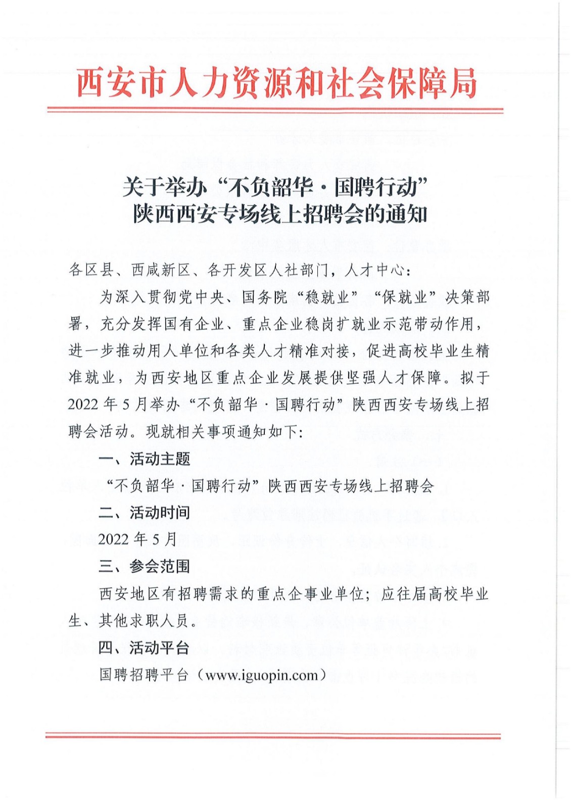 关于举办“不负韶华 国聘行动”陕西西安专场线上招聘会的通知