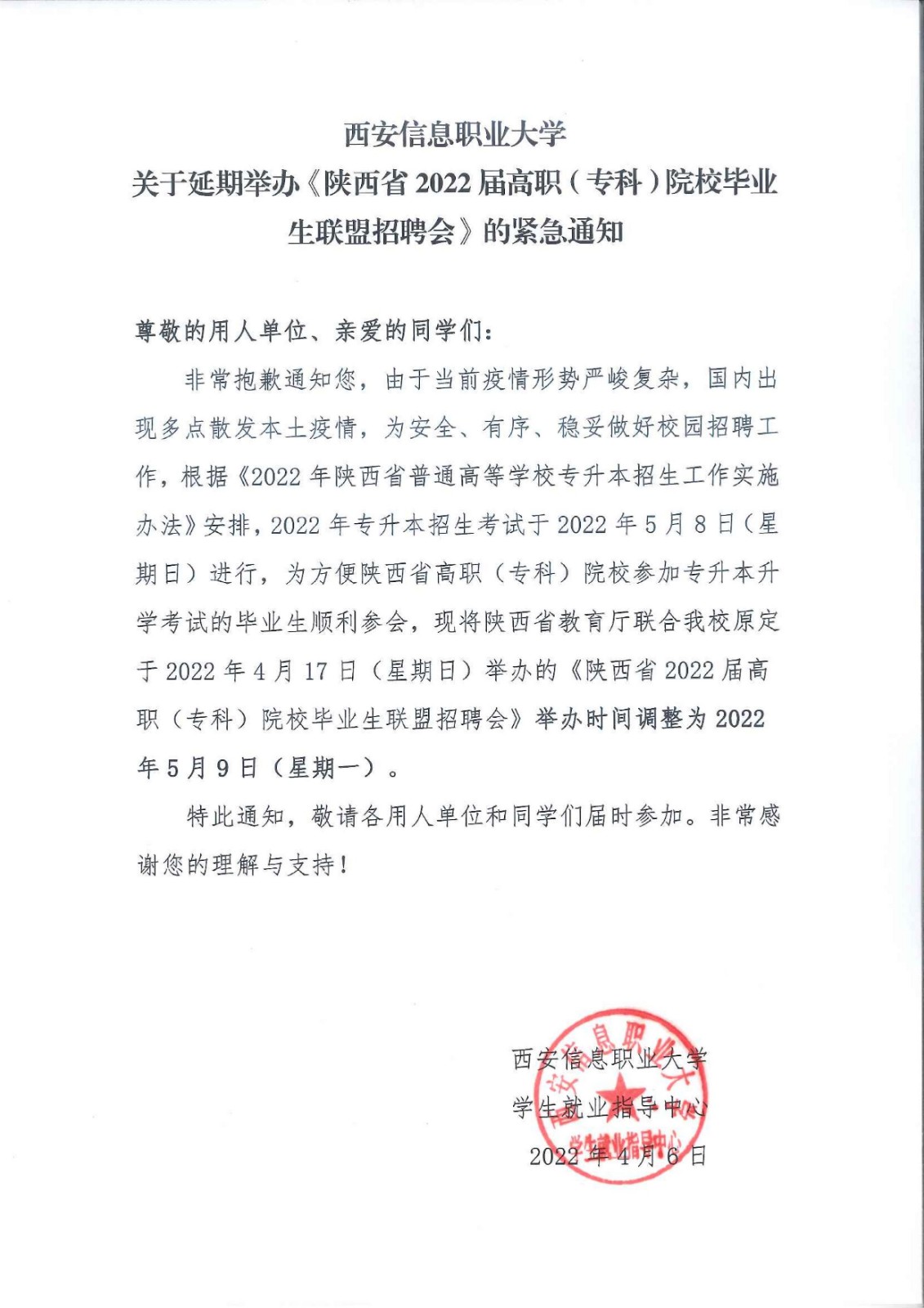 AWC万象城娱乐关于延期举办陕西省2022届高职(专科)院校毕业生联盟招聘会的紧急通知