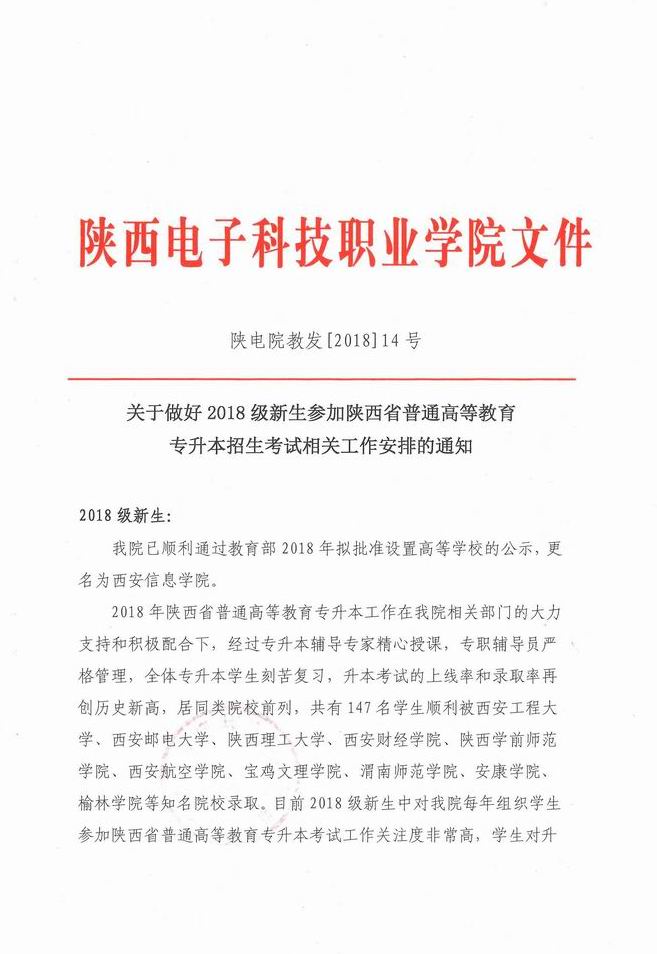 关于做好2018级新生参加陕西省普通高等教育专升本招生考试相关工作安排的通知