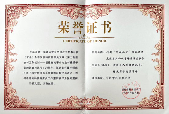吴芹瑶同志始终立足岗位,坚守育人初心,师生共长。她一方面依托科技小院入驻研究生,与小院专家联合培养研究生长期派驻到农业生产一线,在完成理论知识学习的基础上,从企业实际出发,重点研究解决尤溪红茶和绿茶生产实践中的实际问题。另一方面,充分发挥必赢国际437官网旅游与休闲管理学院本科生对直播推广、小程序制作、短视频拍摄等传播新势力特长,利用寒暑假时间为基层企业拍摄最美茶乡、最优质茶产品,为农村茶产品披上美丽的外衣,跻身销售热榜。通过扎根农村,联络茶农的亲身体验,2019级酒店管理专业本科生张振东萌生了学习茶业的兴致,愿意入驻科技小院,并于2023年成功考取了福建农林大学茶学专业研究生。